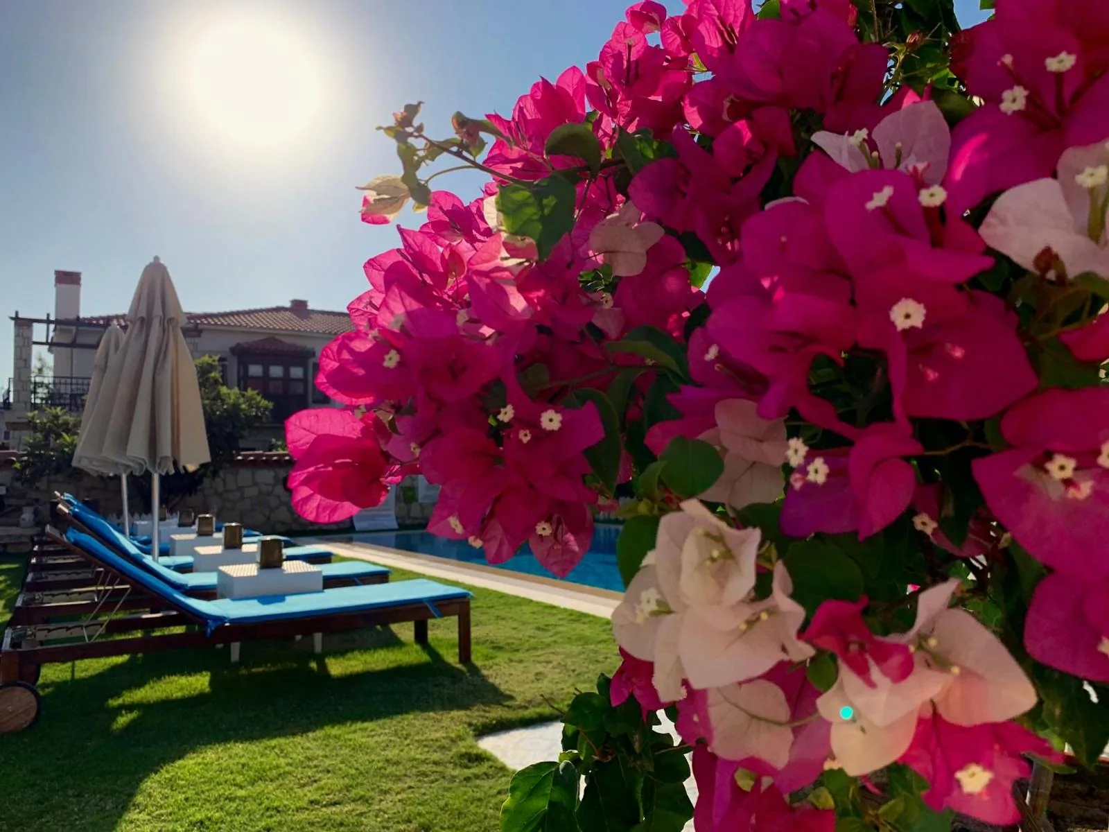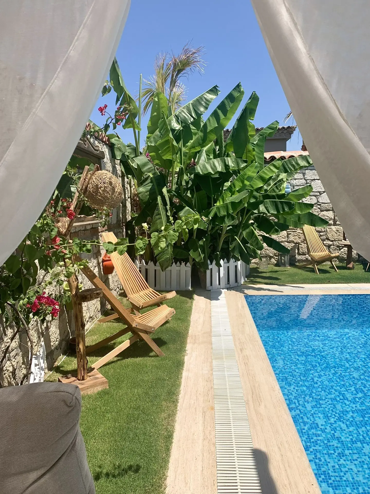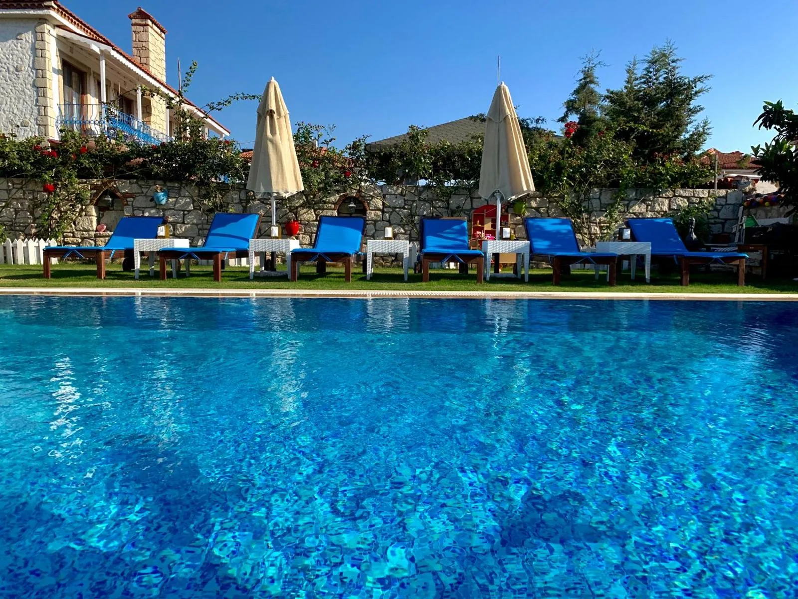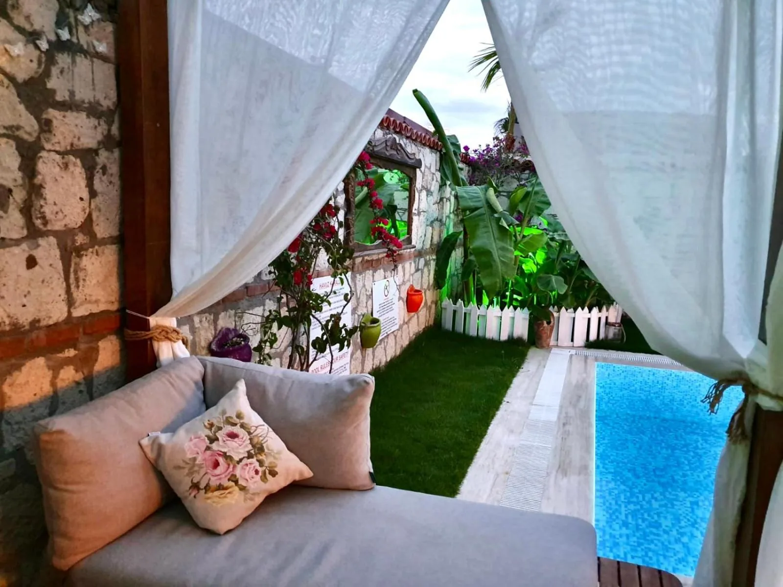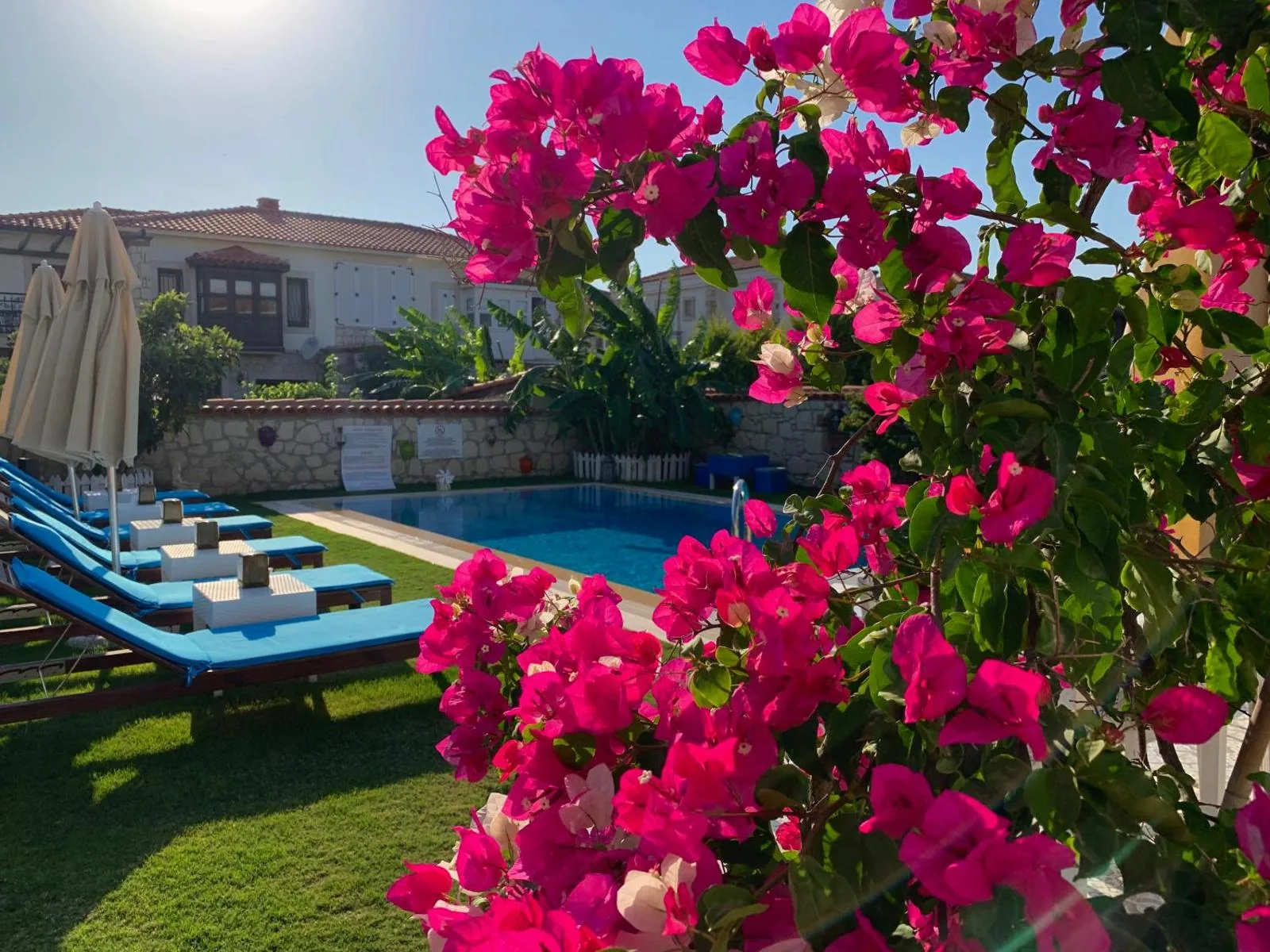 Yer AyırtınMuz ağaçları, begonviller ve güller… Kendinizi evinizde hissedeceğiniz serin bir bahçeye davetlisiniz. Taş kemerli terasımız, havuzumuz ve güneş şezlonglarımız sizi bekliyor.