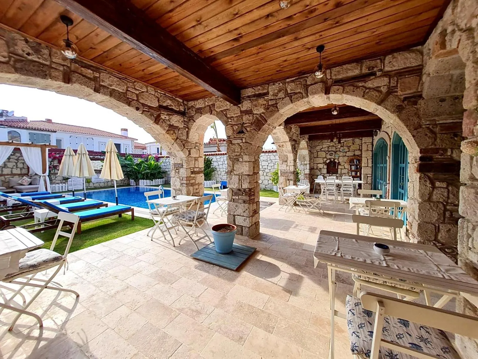 Balkondan havuza ve bahçeye bakan, mavi yastıklı, desenli fayans zeminli sıcacık bir oda. Alaçatı taşının serinliği içeride hissedilir.